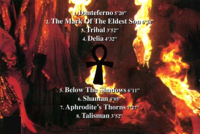 Danteferno Music: Chiva, Lyrics: Steff Terry/Martin Eric Ain Can't cry, can't try, can not repent Can't cry, can't try, can not repent Can't cry, can't try, can not repent When I look back on our misery And all the pain it has brought me I think of life as a cesspool of fate We mess up our souls, with our hate When I look back on our misery And all the pain it has brought me I can't forgive, rest my soul and let it be I can't cry, can not try I can't try, can not cry I can't say, can not stay I can't stay, can not say I can't give, can not live I can't live in despair The Mark of the Eldest Son Music: Chiva/Steff Terry, Lyrics: Steff Terry. Intro by Andy "I disown you, you and against you You gave me life, my mother, my father I disown you, you and against you I'm the door, light of beyond Paradise or hell, I will only know it once I've passed them all I didn't ask anything Now the true face, the rain of darkness It's my face I didn't have the time to see the light of the day Hell, I will only know it once Hate is so sweet when it's animated By shame and vengeance All the things that I had to learn Were stolen I prosternate myself... The angels already come to demand their dues O, I implore you, I don't know anything of this A world, my world opens up to me Is it hell or a sweet melody of melancoly? Time belongs, only to the ones that participate I am what I am Is it hell or a sweet melody of melancholy? Time belongs, only to the ones that participate I am what I am "You, child born in blood In the flesh of the flesh of the cradle Will be the one of the kingdom of death And your mother: the false And your brothers: the other you Tribal Music: Chiva/Steff Terry/Loyd, Lyrics: Steff Terry She makes you dance A valkirie seducing the spirits of beyond She communicates, through those rhythms With the spirit of hades So pure, so deep Magic, mystic, let yourself drift to the beyond In the depths of belief So cold, so glacial Magic, mystic, let yourself drift far away In the depths of life Look for the pleasures within yourself It will guide your aura towards a world Where the trees touch so close that they look like they embra- ce Tribal ceremony So pure, so deep Magic, mystic, let yourself drift to the beyond In the depths of belief So cold, so glacial Magic, mystic, let yourself drift far away In the depths of life So far, you can't imagine it... So strong I can almost touch it I touch their wives and I touch their gods So far, you can't imagine it... So strong I can almost touch it I touch their wives and I touch their gods You can't understand it Ceremony of a cult, of another century Magic, mystic, witness of celtic legends Delia Music: Steff Terry, Lyrics: Gradel The nameless one... is calling you The nameless one is calling you The nameless one is calling you Go to the entrails of the world Go to the beginning Go to the entrails of the world Go to the deepest of her Of you, of me, of the world Dive on the way to the gardens of eden again The sons of existence Hold themselves there Follow the arcanes of time and go back to them Go back to them Divine comedy, life sniggers... Infinite orchestration... Go back as far as the gardens of eden To the entrails of the world Go to the beginning Go to the entrails of the world Go to the deepest of her Of you, of me of the world To know Below the Shadows Music: Steff Terry, Lyrics: Gradel "Melancoly that turns around me, like a thorny rose A thorny rose that winds around me like melancoly" "Melancoly that turns around me, like a thorny rose A thorny rose that winds around me like melancoly" Look over there, the trees next to the frozen lakes are Bored since eternity... Empty and beutiful looks: melancoly... I love you... Same words, same speeches, same gestures Empty and beautiful looks Come and surround me, some and surround me melancoly Come and surround me, some and surround me thorny roses Below the shadow Not a word, not a gesture, beauty... I penetrate the kingdom of death now... Below the shadows, the doors open Not a word, not a gesture, beauty... Below the shadows, the doors open Shaman Music: Steff Terry/Chiva, Lyrics: Steff Terry Time was his dwelling Seasons his gods Life a fierce warrior Death his most sacred ritual within the fire And within his chants His quest, wisdom His rest, his journey Where he lived, these chants symbolized abundance And the woman, renewal and respect He lives where all legends begin Here is the story of this legend, that of the shaman Oh shaman, spirit of the forest Sage among all sages Your people live through you Through your eyes... O shaman... Worshiper of the eagle Of pure convictions in your beleifs Take my hand, take me where those who love Through your eyes Become one sole being Show me the lakes where your ancestors were bathed In order to be marked by your sign Show me mountains of the north Prairies of the south, horizons from the west to the east Show me your flesh... Your people were and will be noble in my heart Your blazing name still and forever keeps my dream Of your savage domain O dream of crystal, the leaves, entwined Remain the sole trace of your mark Aprodites Thorns Music: Christine, Lyrics: Steff Terry Erotic fantasies: aphrodite of cnide and aries As mystic as a glimmer at the bottom of a lake Sensuality of your figure, of your white body White dove or dark crow? The temptations of these acts change the being, from the beast to... To the lamb But if you touch her, she will cut your veins and dive her hand Deep down in your soul to spread it over your face Sweet venus, in power of an immense veil beyond the borders of Death, seduces men with her charm and elegance Pleasure of lust, she is also the sweetness of the flower blinding the Insect that comes to take her nectar O the pleasure is so swet in aprodite's thorns, but if you touch Her... she will cut your veins Talisman Music: Steff Terry/Chiva, Lyrics: Steff Terry "Dark symbol you release the spirits" Spirits that ravage the sky and t