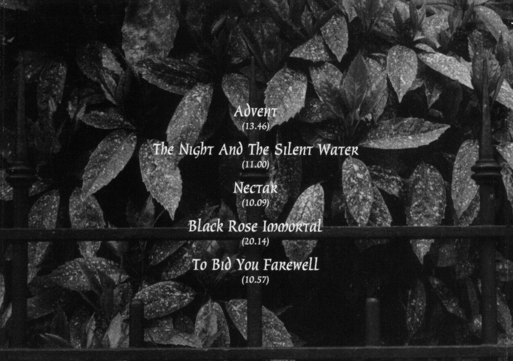 The Night and the Silent Water And so you left us Jaded and gaunt, some September Wilted with the seasons But hidden inside the delusion I saw you eyes, somewhere Devoid of death The aura poises amidst (the storm) In solid tears I linger A parlour glade, moonlit sorrow Lonely resting pools Relics of the moon-dogged lake Whisper: "All your words are missgiven" Am I like them? Those who mourn and turn away Those who would give anything To see you again If only for another second Your face was, like the photograph Painted white We did not speak very often about it What does it matter now? Cloak of autumn shroud I gaze, dim ricochet of stars I reckon it is time for me to leave You sleep in the light Yet the night and the silent water Still so dark Nectar I arose from the lullaby Enduring yet another tale You tempt me again With your embrace, so tainted Within the night you beckon Cursing me with every glance Bring me through Carry my empty shadow And guide me inside your warped labyrinth To the well of sin I swear I will always love you Leave me speechless Release my yearning The soil I walk is clad with light Drifting moons thrust me with their rays And I fall inside I lament this heritage Cannot bid farewell The pale face...you went as far as you could And from that moment I witnessed your beauty, fealt your death Mine is yours, mine is yours In the wake of dawn The mist of morning linger before it leaves Invisible eyes, red reflection It is you Smiling in the midst of the moor Black Rose Immortal In the name of desperation I call your name A lamentation I sigh Again and again Spiritual eclipse The gateways are closed for me to seek The night... A veil of stars, watching My shadow is born from light The light of the eye, in darkness Over troubled waters memories soar Endlessly, searching night and day The moonlight caresses a lonely hill With the calmness of a whisper I wear a naked soul A blank face in the streaming water It is cold in here Frost scar my coat with dust Eyes attach to your mute portrait We spoke only through thoughts Together we gazed, awaited Hours brought thirst and the rising sun Sunbirds leave their dark recesses Shadows glid the archways Do not turn your face towards me Confronting me with my lonliness You are in a forest unknown The secret orchard And your voice is vast and achromatic But still so precious Lullaby of the crescent moon took you Mesmerized, its kaleidoscopic face Granted you a hollow stare Another soul within the divine herd I have kept it The amaranth symbol Hiddin inside the golden shrine Until we rejoice in the meadow Of the end When we both walk the shadows It will set ablaze and vanish Black rose immortal It is getting dark again Dusk shuffle across the fields The evening trees moan as if they knew At night I always dream of you To Bid You Farewell I am awaiting the sunrise Gazing modestly through the coldest morning Once it came you lied Embracing us over autumn's proud treetops I stand motionless In a parade of falling rain You voice I cannot hear As I am falling again Devotion eludes And in sadness I lumber In my own ashes I am standing without a soul She wept and whispered: "I know..." We walked into the night Am I to bid you farewell? Why can't you see that I try When every tear is shed Is for you? Lyrics in plain text format |
