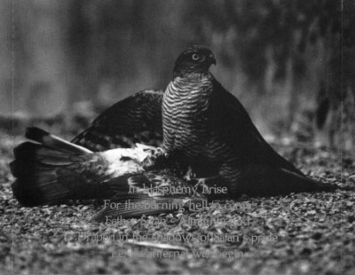 Draped in Shadows of Satan's Pride * Text by Hate Rodvitnesson ** Text by Nocturno Culto, Sept. '98 for Mactätus exclusively Music by Mactätus "In Blasphemy I rise For the burning hell to come Father Satan Almighty god Draped in the shadows of Satan's pride Let the infernal war begin"* To be the right hand of the devil To see sights too morbid and grim For mortals to bear To guide vast hordes of religious bastards Through the gate to the valley of death To rest by the greatest sites, in the kingdom of pain Always hear our master, breed fear and panic through the masses The millennium to come, will be the greatest For souleating demons Feast upon christian carcass To be the right hand of the Devil My vision till I die Transfer blasphemy to battlefield To whom it may concern: Fight in the shadow of Satan's pride Drain lifeforce out of religious swines Spread the word, we intend to win the fight Commit suicide at our command** King of the Dark Side Text by Hate Rodvitnesson Music by Mactätus Under the dark night Shine the twisted moonlight Blessed by Satan I dwell in the depths of hell Force from the devil in struggle with the light Soon the throne of god will disappear The earth will be a kingdom of evil Where sickness and chaos will rule They who not worship the evil will be doomed The christian believers suffer In the flames of hell for eternity A black star will shine over the mighty new throne The lord of chaos will rule A satanic war is under my command The gate to hell is clear Join our dark army and fight till the end The bringer of wisdom has spoken Blood will flow in our time when everything is ruin "Under the dark night shine the twisted moonlight Blessed by Satan I dwell in the depths of hell Force from the devil in struggle with the light" I am one of those who are burning your souls Flesh will burn and corpses will crawl into the night of anger We are of those who make you suffer for eternity For our lord Satan we will sacrifice our soul In the dark night of evil Sleepless Souls Text by Tony Abrahamsen Music by Mactätus I am the voice Midnight shimmering Why can't you just open your mind I'm tired of listening to the screams Which comes from inside Try to sleep now in solitude you shall awake Sleep as a child all I feel is he's shattering gaze Come with me I'll protect you from the voices within I can't I wish I was close to you I can't bear this pain Adrian please wake me... Screams are shattering your vains Promises only pain shall remain Why do you struggle your fear My gaze shall shatter your stear Why do you petty yourself Why can't you reach out instead Why won't you trust me I am your voice you shall see... There's no sleep tonight Flashing memories fills my mind I fell so close to you Can't you stay with me until eternity Screams shall forever reach your mind Why, cause only one day you shall be mine Creation of souls I make them blind Eternal, soon they shall all be mine... The Emperor's Trail Text by Hate Rodvitnesson Music by Mactätus A dark tower in the twilight mist A sorcerer that call upon his raven The night that never comes to an end Children of the Devil dancing over a dead child of christ Tears of crystal falling from god's blind eyes Which is paralysed by laughter from the night Where only demons and dragons are ravaging Lost souls on nightslaughter over everdead highlands Where the emperor of darkness has left his trail Towers that rise on each side of the kingdom And the night will never come to an end And the unholy wizards will put a spell on me I'm possessed by Satan En Trone Vevd Av Tid Text by Istar Music by Mactätus I en regntung kveld fylt av tåke og dis Jeg så en svartkledd kvinne Hennes ord lød så fagert, hennes røst så fin Da hun lokket meg til skogen Hun sang mag gamle sanger Hun fortalte meg mangt et sagn Ved et tjern i den trolske skogen På en trone vevd av tid Sitter hun den fagre volve Og lokker meg til sitt rike Hun synger sanger så fagre I nattens kalde mørke Hennes sanger om ære river min sjel Hennes ord om strid skaper lengsel Jeg kjenner nattens kulde svøpe meg En søvn til neste storhetstid Sønn Av Torden Text by Hate Rodvitnesson Music by Mactätus Jeg sønn av torden som vandrer blant alver of troll Hersker over denne skog Der hvor intet menneske har satt sitt spor Der hvor trollmen og drager har rådet i all sin tid Og de høyeste slottstårn berører himmelriket Der hvor dragene driver sine blot Der hvor fjelltrollet holder Sin offerfest med sine kjemper Rister jorden som torden Og alle da små alver gjemmer seg I sine trygge små hjem Mens andre taper sitt liv blant de store Skogens lyseste slette er slik som mørkets mørke dal Hvor kun dragene skaper lys Og nattens krigere trer frem Mens trollmenn sprer sin trolldom Og i enden av skogen kan man skimte fandens sorte kappe... Dark Journey Text by Hate Rodvitnesson Music by Mactätus I am the master of your dreams I am your worst nightmare I am the core of hell Come to me and deserve your place I am the seasons I am your lust I am the key to the secret Infernal lust to the gate of suffering In the darkest night, and from the deepest woods I stand in flames and the sun is no longer there... In snowless moorland I search for the glutton And see its enjoyment to kill I have my damnation I am the master of this world My pleasures will come to reality. My anger will appear And my victory will come "In front of me, I can see thy hell fire burning in the darkness My body shivers from the presence of thy almighty power I am under thy command" I am the seasons I am your lust I am the key to the secret Infernal lust to the gate of suffering I am the winterwolf I am the spirits of evil I am eternity Into the delicate of malice Provenance of Cruelty Text by Hate Rodvitnesson Music by Mactätus Oh... darkness inside me, please let me out of here I can't feel anything any more You can't hide yourself from me, I am inside you Oh god, what is this Wher am i and where is my god I